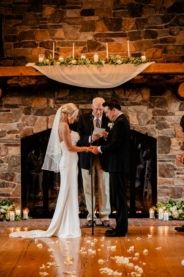 With colder weather moving the ceremony indoors, the fireplace became the ideal backdrop for their “I do” moment. Standing beside them were their adult children from both sides, blending their families in a way that was heartfelt and memorable. Nothing cuter than seeing their dog make his way down with their rings,